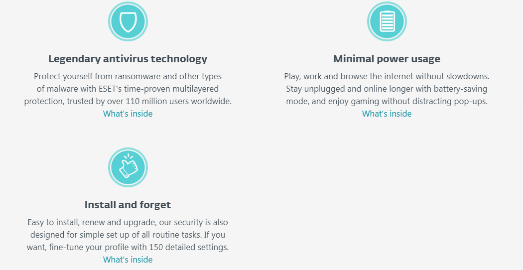 LEGENDARY NOD32 ANTIVIRUS Protects you against all types of malware, including viruses, ransomware, worms and spyware. LIGHT ON COMPUTER RESOURCES Enjoy the full power of your computer. Play, work and browse the internet without slowdowns. UNINTERRUPTED GAMING AND VIDEOS No system updates or annoying pop-ups while you play games or run a program in full-screen mode. LEGENDARY ANTIVIRUS TECHNOLOGY Protect yourself from ransomware and other types of malware with ESET’s time-proven multi-layered protection, trusted by over 110 million users worldwide. MINIMAL POWER USAGE Play, work and browse the internet without slowdowns. Stay unplugged and online longer with battery-saving mode, and enjoy gaming without distracting pop-ups. INSTALL AND FORGET Easy to install, renew and upgrade, our security is also designed for simple set up of all routine tasks. If you want, fine-tune your profile with 150 detailed settings.